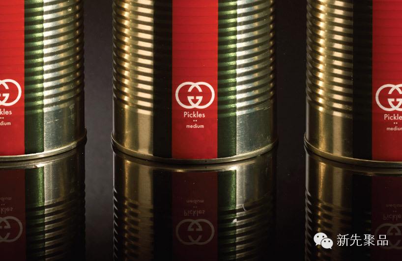 不久前一位前无古人的以色列艺术家 Peddy Mergui,就构想出一系列具有大牌风格的食品包装,每一款制作精良的包装都承载着一个熟悉的品牌,比如蒂芙尼优酪乳、Gucci 罐头、LV 肉肠、NIKE 柠檬容器等。从品牌 logo、配色,甚至于字体和命名方式都被运用到包装中,让食品看起来怪诞有趣又蛮合乎常理。