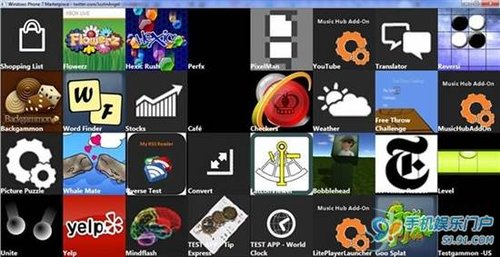 在截图中可以看到包括天气、股票、水平仪、文档编辑、世界时钟、图片编辑、购物清单等常用应用,而YouTube、Yelp也将会作为WP7的内置应用出现,YouTube将会与系统中的音乐和视频中心进行整合,用户可以直接通过Zune视频中心访问YouTube视频。